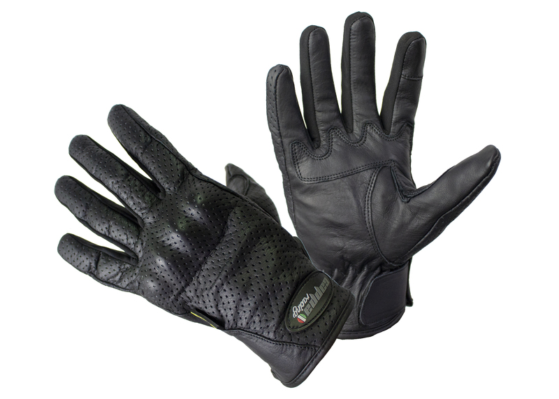 Krátké kožené moto rukavice v černé barvě. Certifikované s pevnými chrániči. Lehké a prodyšné, se zapínáním na suchý zip.