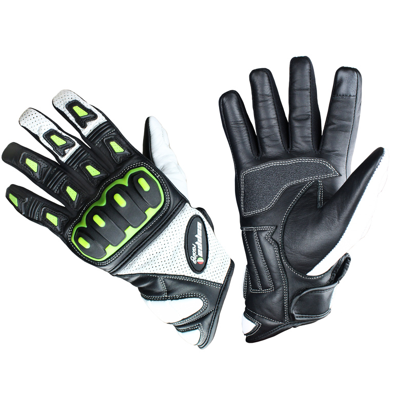 Krátké kožené moto rukavice v černo-bílo-zelené barvě, vhodné do teplého počasí. Certifikované s pevnými i měkkými chrániči. SmartTouch prst pro ovládání telefonu.